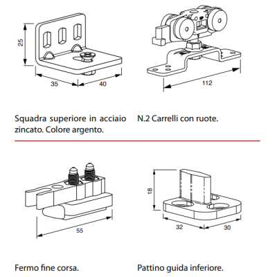 CONFEZIONE CON COPPIA CARRELLI, COPPIA PARACOLPI E PATTINO GUIDA PER PORTE APPESE PORTATA 80 kg