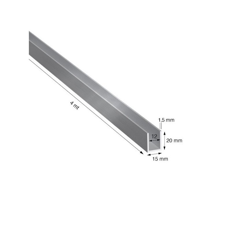 PROFILO A U IN ALLUMINIO, LEGA 6060/T5, MISURA 15x20x1,5 mm, FINITURA GREZZA, LUNGHEZZA PROFILO METRI 4