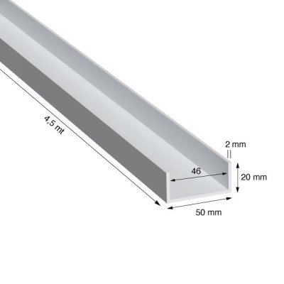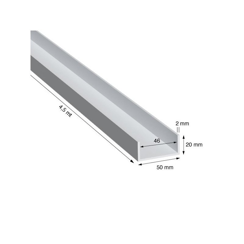 PROFILO A U IN ALLUMINIO, LEGA 6060/T5, MISURA 50x20x2,0 mm, FINITURA ANODIZZATA COLOR ARGENTO, LUNGHEZZA PROFILO METRI 4,5