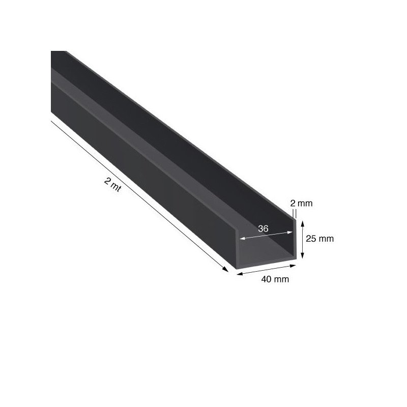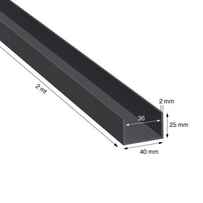 PROFILO A U IN ALLUMINIO, LEGA 6060/T5, MISURA 40x25x2,0 mm, FINITURA ANODIZZATA COLORE NERO, LUNGHEZZA PROFILO METRI 2