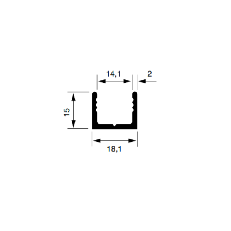 PROFILO A U IN ALLUMINIO, LEGA 6060/T5, MISURA 18,1x15x2,0 mm, FINITURA ANODIZZATA COLOR ARGENTO, LUNGHEZZA PROFILO METRI 2