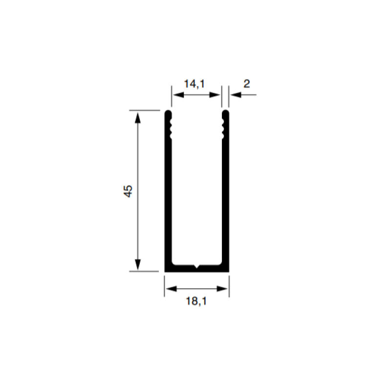 PROFILO A U IN ALLUMINIO, LEGA 6060/T5, MISURA 18,1x45x2,0 mm, FINITURA ANODIZZATA COLOR ARGENTO, LUNGHEZZA PROFILO METRI 3