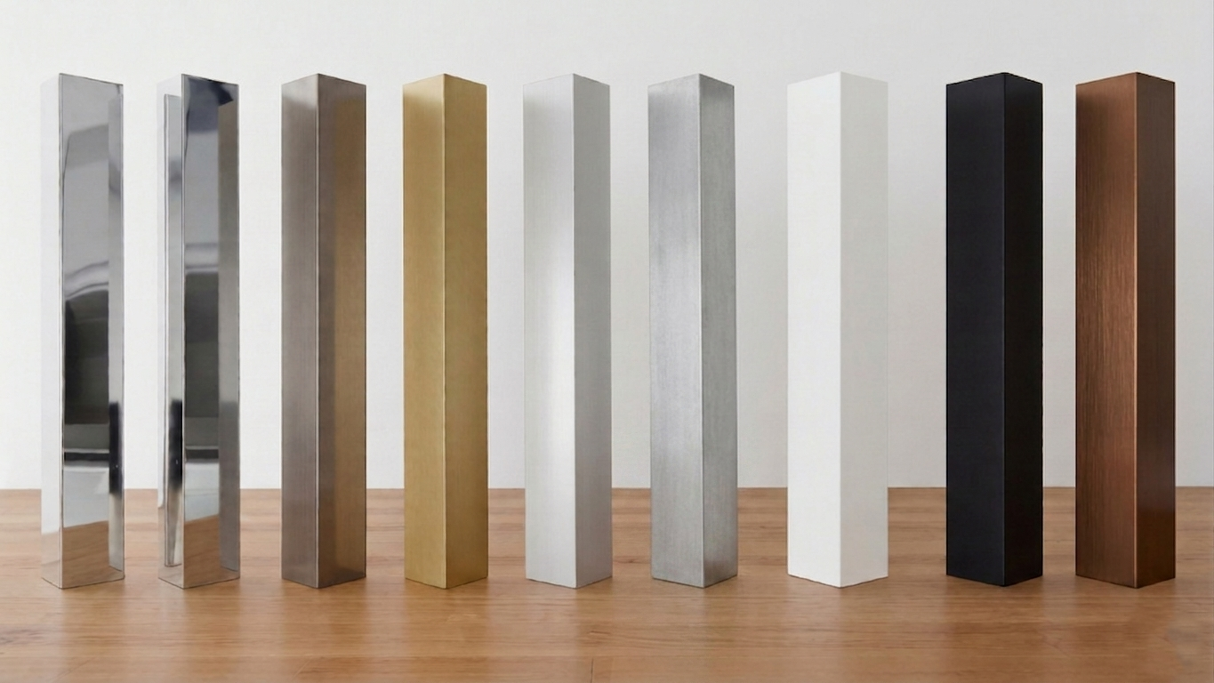 Lucido a specchio, cromo lucido, acciaio lucido, anodizzato oro, anodizzato argento, grezzo, bianco verniciato RAL 9010, anodizzato nero elettrocolore, anodizzato bronzo.